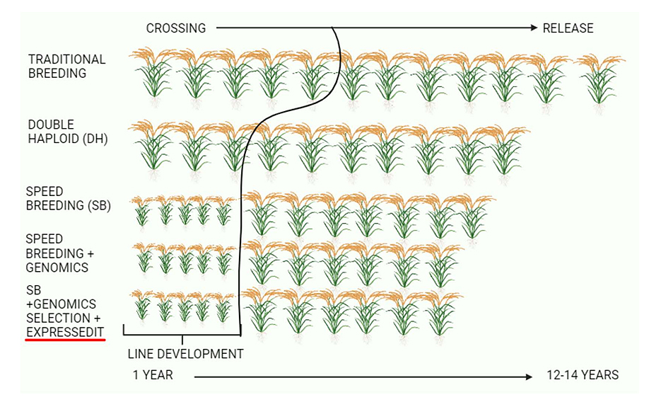 In an innovative approach called ‘ExpressEdit’, the integration of SB and genome editing tools has effectively circumvented many of the traditional labour-intensive steps, thereby alleviating the workload in the laboratory and contributing to time-efficient crop generation. ExpressEdit represents a novel technique that combines marker-assisted selection and preassembled genome editing tools (e.g., CRISPR Cas9 and CRISPR-Cpf1) with SB, streamlining the process of eliminating the delicate callous culturing step [14]. Integrating state-of-the-art technologies such as SB with genetic engineering and genome editing has been employed as a novel approach in several crop breeding programmes to speed up the process of introgression of desired traits and varietal development [19,38,69] (Figure 4).