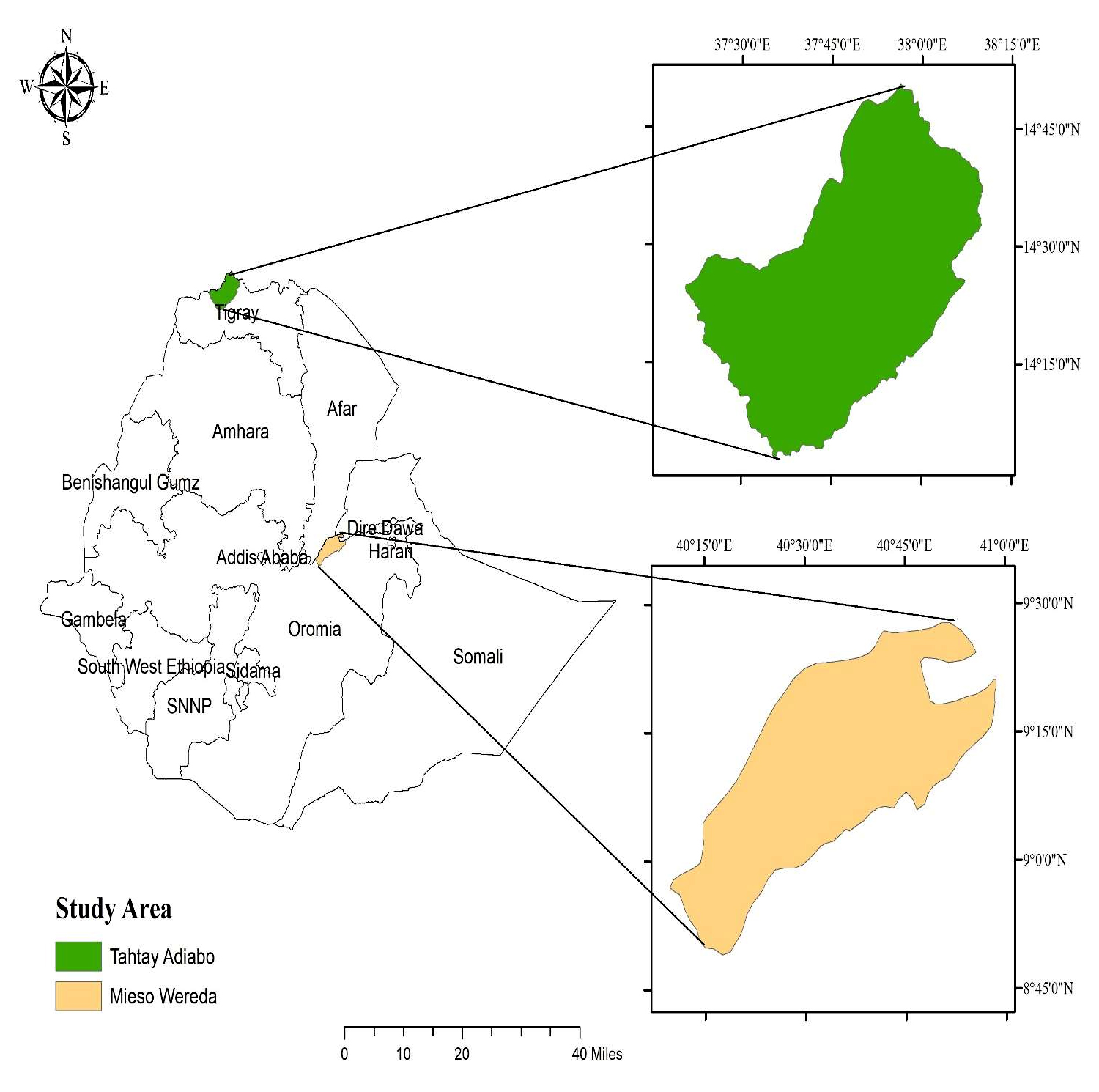 The research was implemented at two research sites specifically Sheraro (14°24′N/37°45′E) and Miesso (9°14′N/40°45′E); where sorghum is the major crop (Figure 1). The experiments were conducted during the 2018 growing season. The altitudes for Sheraro and Miesso are 1010 and 1470 meters above sea level, respectively. The soils in both Sheraro and Miesso are dark clay vertisols. The agro-ecology of Sheraro and Miesso is SM1 (SM1-4) sub-moist hot warm lowland and SM1 (SM1-1) hot to warm sub-moist plains, respectively [18]. The range of temperature during the growing season was from 14.38 to 37.76 ℃ and the average of rainfall was 653.9 mm at Sheraro (Supplementary Figure S1). Whereas the temperature range and average rainfall at Miesso during the same period were 16–31 ℃ and 355.3 mm (Supplementary Figure S2).