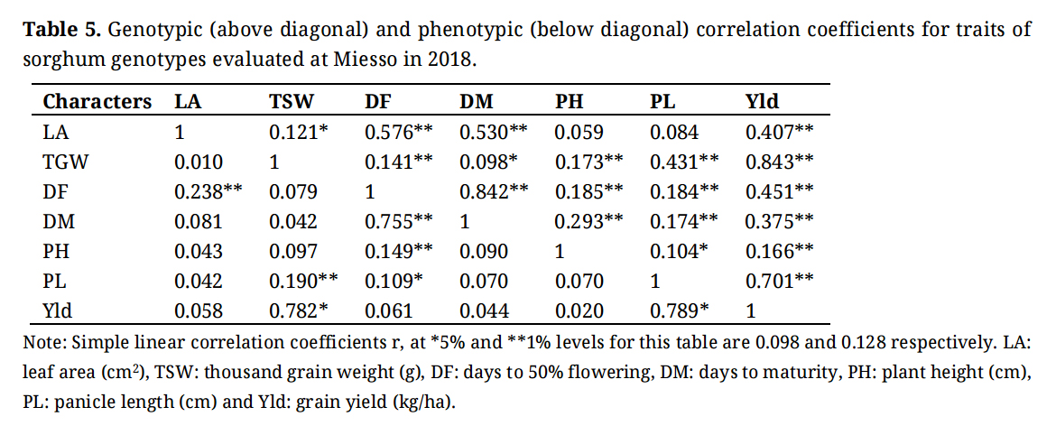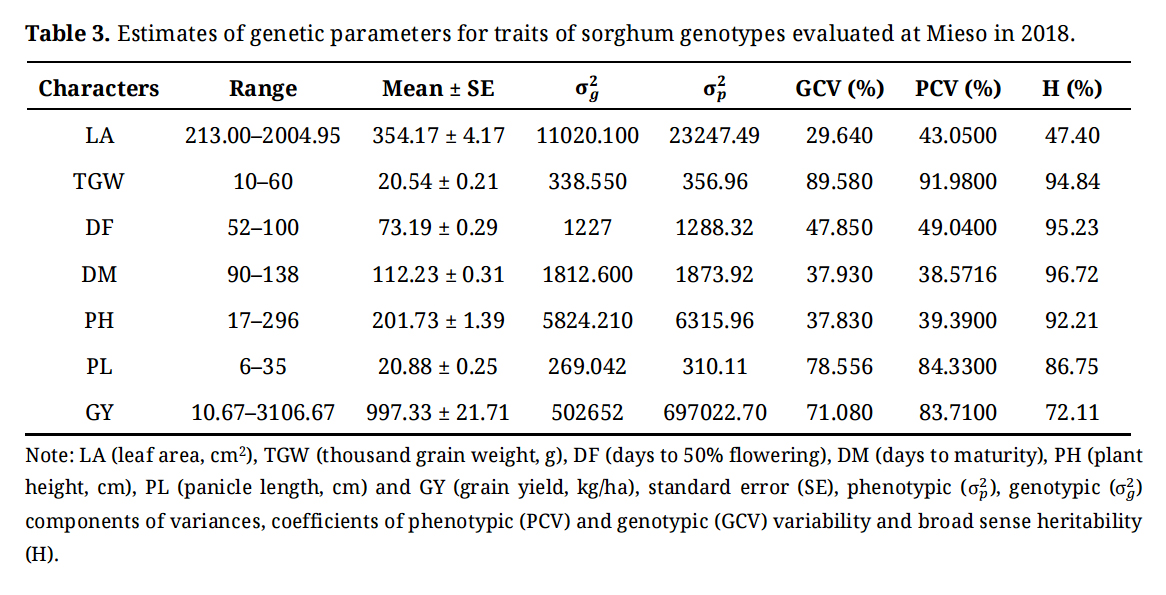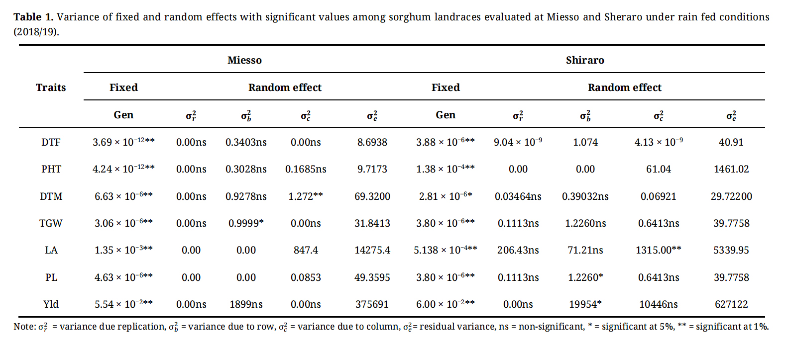 Analysis of variance showed highly significant differences among the sorghum genotypes both at Sheraro and Miesso for seven traits, indicating the existence of broad genetic variability among them (Table 1).