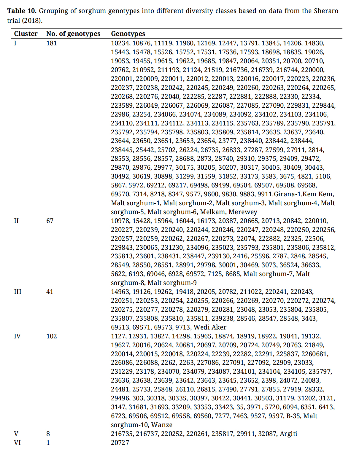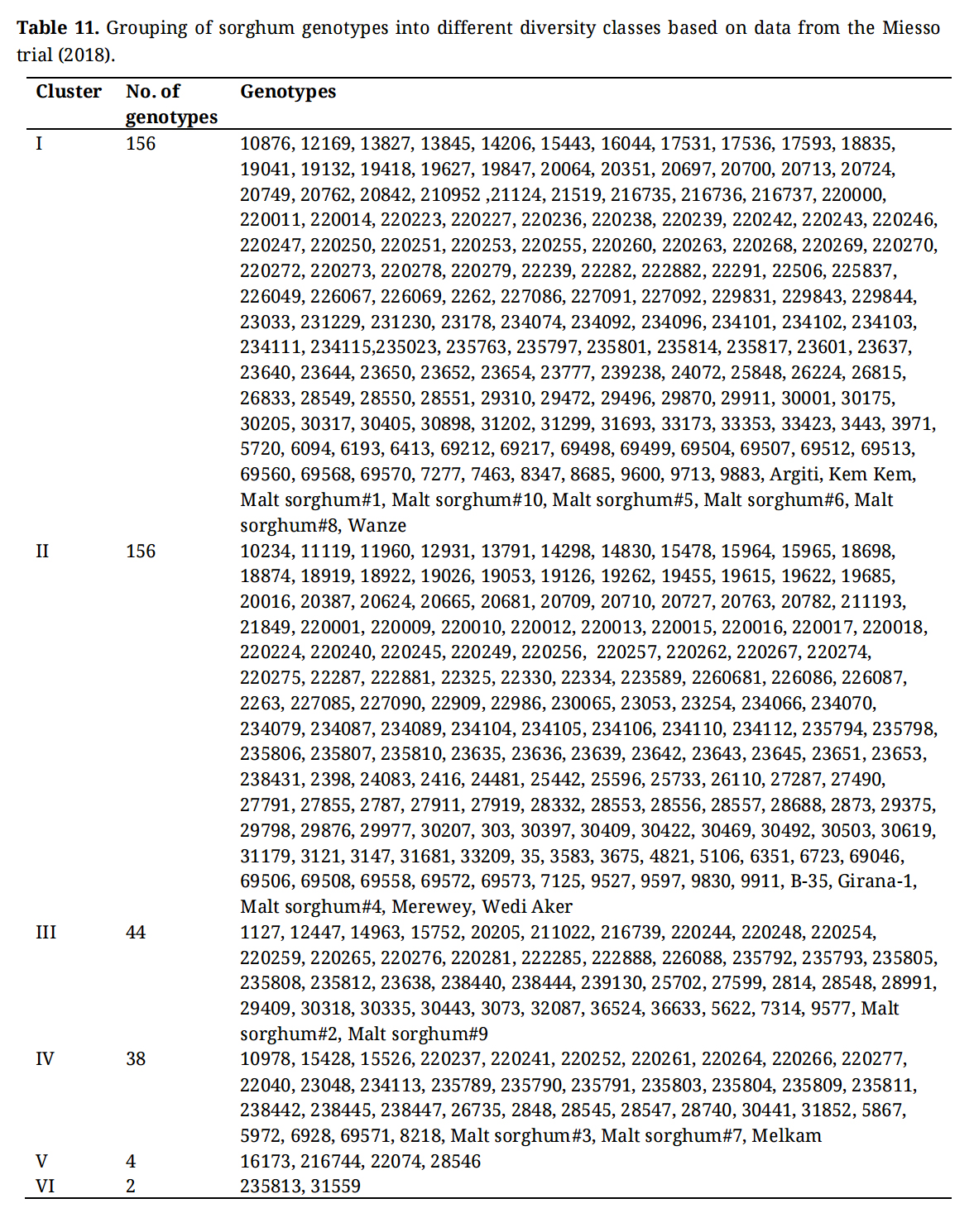 At Sheraro, the analysis of the 400 genotypes grouped them into six clusters with different numbers of genotypes in each cluster (Table 10). Cluster I had the largest number of entries, which is 181 (45.25%), followed by Cluster IV with 102 (25.5%) genotypes, cluster II with 67 (16.75%) genotypes, and cluster III with 41 (10.25%) genotypes. The remaining clusters (cluster V and cluster VI) had eight (2%) and one (0.25%) genotype, respectively. The analysis for the data from Miesso showed that the 400 germplasms were grouped into six clusters (Table 11). Clusters II and I had the highest number of genotypes with 156 (39%) genotypes each, and Cluster III is next with 44 (11%) genotypes, cluster IV with 38 (9/5%) genotypes, cluster V with 4 (1%) genotypes and cluster VI with 2 (0.5%) genotypes. A cluster with a single genotype may be due to total isolation preventing the gene flow or intensive natural/human selection for diverse adaptive complexes. From the breeding point of view, these genotypes are very important. They can have very important genotypes with desirable characteristics.