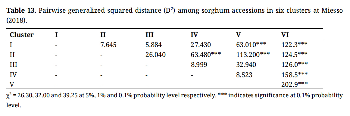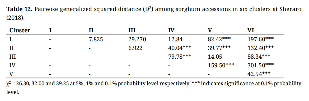 The mean inter-cluster D2 values for Sheraro are given in Table 12. The χ2-test for the 6 clusters showed that there was a statistically highly significant difference (P = 0.1%) in all traits except for cluster I with II (7.825), I with III (29.27), I with IV (12.84), II with III (6.922) and III with V (14.05). The topmost mean inter-cluster D2 was recorded between cluster IV with cluster VI (D2 = 301.5) followed by cluster I with cluster IV (D2 = 197.6) and cluster IV with cluster V (D2 = 159) which had shown the largest inter-cluster distance. Likewise, the average inter-cluster D2 values for Miesso are presented in Table 13. The χ2-test for the six clusters indicated that there was a statistically highly significant difference (P = 0.1%) probability level in all characters except cluster I with II (7.645), I with III (5.884), I with IV (27.43), II with III (26.04), III with IV (8.999) and IV with V (8.523). The highest average inter-cluster D2 was recorded between cluster V with cluster VI (D2 = 202.9) followed by cluster IV with cluster VI (D2 = 158.5) and cluster III with cluster VI (D2 = 126) which had shown the largest inter-cluster distance. These clusters were genetically more divergent from each other than any other clusters.