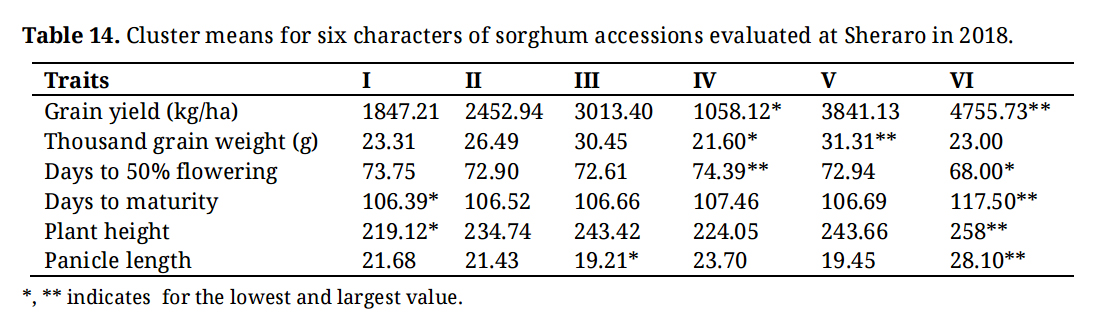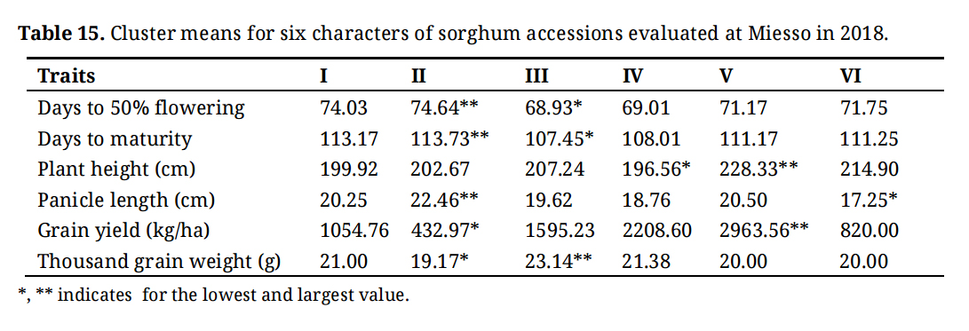 In the case of Sheraro, the mean value of the quantitative morphological descriptors in each cluster is shown in Table 14. Cluster I had the description of the shortest days to maturity and shortest plant height. The remaining traits were reasonable in magnitude. Cluster II was described by moderate magnitudes of all the characters. The smallest panicle length characterized cluster III and the remaining traits were modest in magnitude. The smallest grain yield, smallest thousand-grain weight, and the longest DF illustrated cluster IV. Cluster V was characterized by the largest thousand-grain weight; the following features characterized Cluster VI: largest grain yield, shortest DF, longest DM, tallest plant height, and largest panicle length. The average value of the quantitative characters at Miesso is given in Table 15. All the traits in cluster I showed moderate results in magnitude. The longest DF, longest DM, largest panicle length, smallest grain yield, and smallest thousand grain weight characterized cluster II. The shortest DF, shortest DM, and largest thousand grain weight characterized cluster III. Cluster IV was characterized by the shortest plant height whereas. Cluster V was characterized by grain yield and tallest plant height; the smallest panicle length characterized Cluster VI.