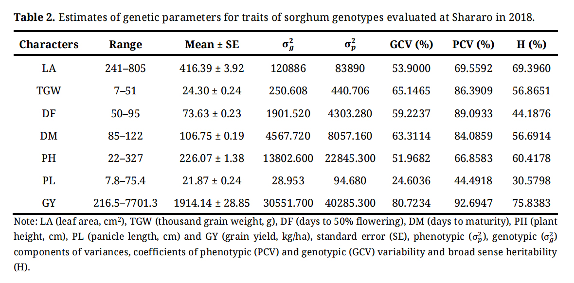 Analysis results of phenotypic ( ) and genotypic ( ) variances and phenotypic (PCV) and genotypic coefficients of variation (GCV) are presented in Table 2 for the Sheraro site and in Table 3 for Miesso. The genetic coefficient of variation at Sheraro ranged from 24.6% for panicle length to 44.49% for grain yield. The range of genetic coefficient of variance at Miesso was from 29.64% for leaf area to 89.58% for thousand-grain weight. Similarly, the range for phenotypic coefficient of variation at Sheraro was from 44.49% for panicle length to 92.88% for grain yield. The phenotypic coefficient of variation at Miesso varied from 38.57% for DM to 91.98% for thousand-grain weight. The GCV values were lower than that of PCV in this study, signifying that the environment had more effect on the expression of these traits. All the seven traits studied at Sheraro and Miesso had high phenotypic and genotypic coefficients of variance. This reveals that selection may be efficient based on these characters and could be a good indicator of genetic potential.