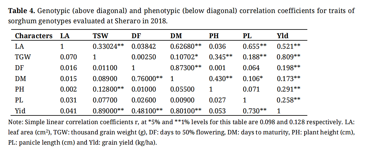 The phenotypic and genotypic correlations of grain yield with other characters are presented in Tables 4 and 5. The scope of genotypic correlation of grain yield with other characters starts from 0.809 for thousand grains weight to 0.173 for days to maturity at Sheraro. At Miesso, it ranged from 0.843 for a thousand grain weight to 0.166. Traits that correlate significantly with grain yield may be crucial grain yield predictors in improving grain yield in sorghum. Grain yield showed highly significant and positive genotypic correlation with thousand-grain weight, leaf area, DF, DM, plant height, and panicle length at both sites. Grain yield with panicle length, days to maturity with days to 50% flowering, and grain yield with thousand grain weight had significant positive associations. In contrast, the rest of the correlations among morphological descriptors were non-significant.