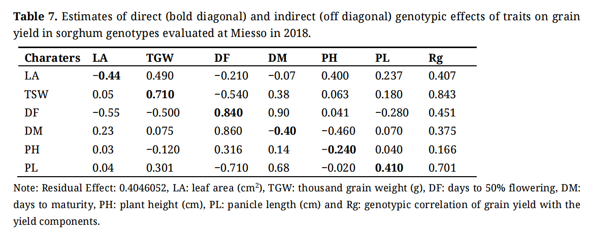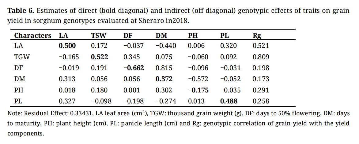 Path co-efficient analysis delivers an efficient method of splitting direct and indirect causes of correlation. It permits a determinant look to recognize the specific forces acting to produce a given association and measures the relative importance of each causal factor. The genotypic direct and indirect effect of different characters on grain yield kg/ha is presented in Tables 6 and 7. thousand grain weight pursued by leaf area, panicle length, and DM exerted a positive prominent direct effect on grain yield at Sheraro whereas days to fifty percent flowering, 1000-grain weight, and panicle length showed direct positive effect on grain yield at Miesso. Thousand grain weight and panicle length exerted a direct positive effect on grain yield at both sites. Thus, according to both sites, selecting sites selecting genotypes having large thousand grain weight and long panicle length could be used to improve grain yield in sorghum genotypes because of their direct effect on yield.