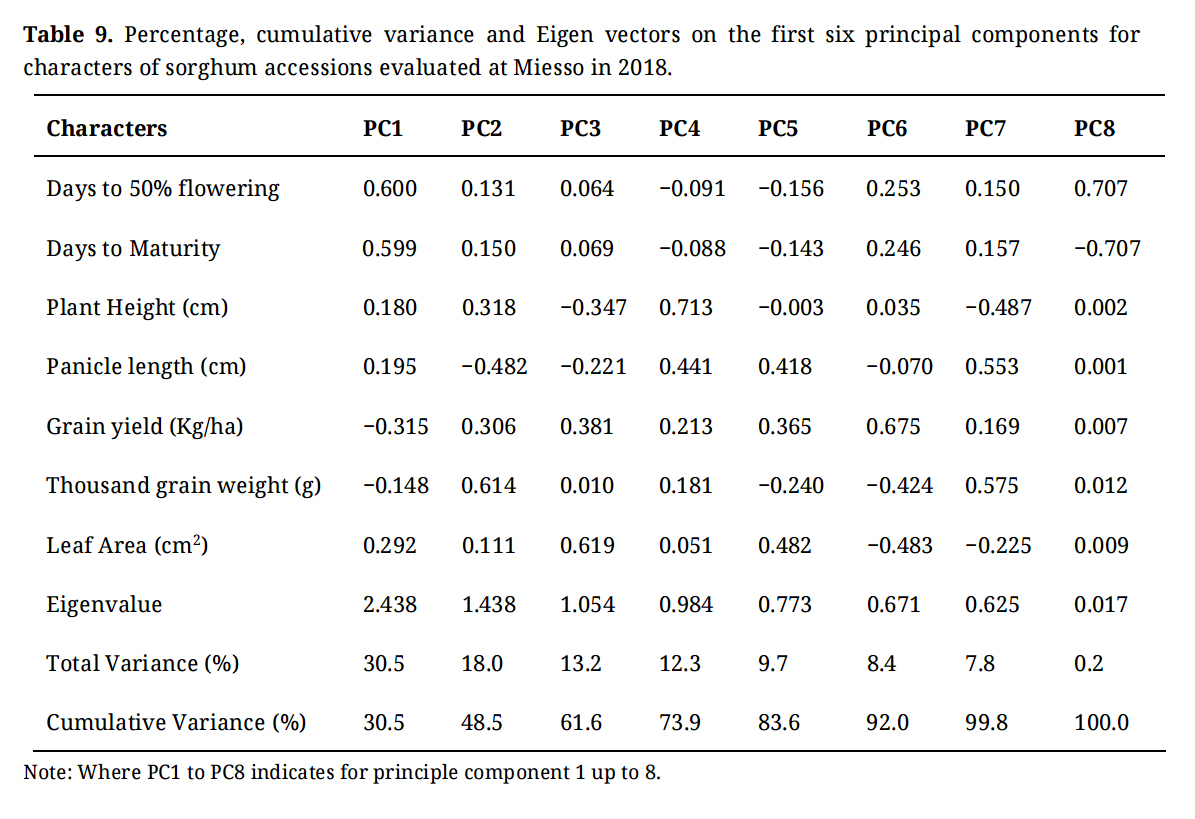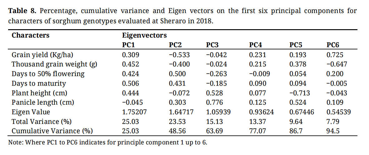 The principal component analysis on data from Miesso (Table 9) showed that out of eight components, three principal components scored most the genetic variance. Sixty-one and 6/10 percent of the total variability among the four hundred genotypes evaluated for seven morphological traits was scored by the first three principal components with Eigenvalue > 1. Only 38.4% of the total morphological diversity among the genotypes studied was scored by the remaining PCAs. The main morphological traits in PCA 1 that contributed to the variations among the accessions were days to maturity (DM), days to 50% flowering (DF), leaf area, panicle length, and plant height which had positive factor loading value whereas grain yield and thousand grain weight had contributed negatively. PCA 2 was related to diversity among sorghum genotypes due to thousand-grain weight, plant height, grain yield, DM, DF, and leaf area. Panicle length had a negative factor loading value.