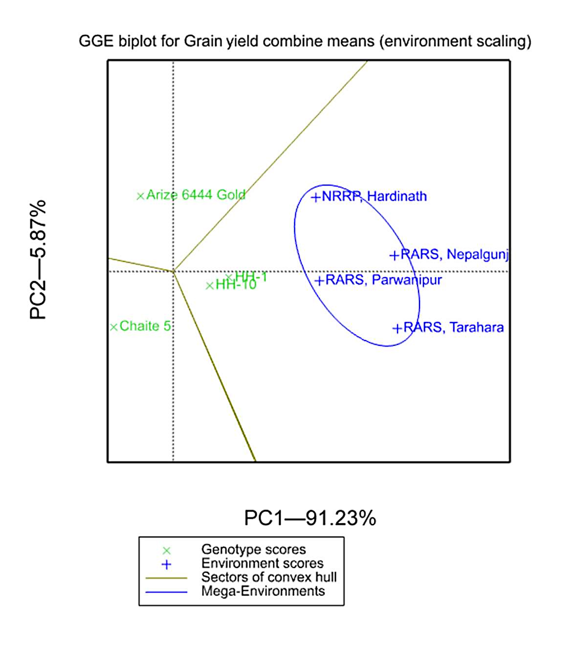 Stability Analysis of Hardinath Hybrid-1For sustainable production across diverse environments, it is important to have stable genotypes. The stable genotypes should lie close eigen line along with high yield potential. The Eigen line in a GGE biplot represents the principal component (PC1) axis, which explains the highest variance in the dataset. The eigenline (PC1) axis is crucial for identifying which genotypes perform consistently well. Understanding the Eigen line helps in selecting genotypes with high and stable yields. Hardinath Hybrid-1 (HH-1) was evaluated in a multinational hybrid evaluation trial across four different agricultural stations over two representative years, 2017/18 and 2018/19. The inbred variety Chaite 5 and the hybrid variety Arize 6444 Gold were used as check varieties in both years. The GGE biplot analysis indicated that Hardinath Hybrid-1 (HH-1) is positioned near the center of the biplot i.e., near the eigenline, suggesting that it is highly stable and possesses broader adaptability, making it a variety suitable for wider growing conditions (Figure 1).