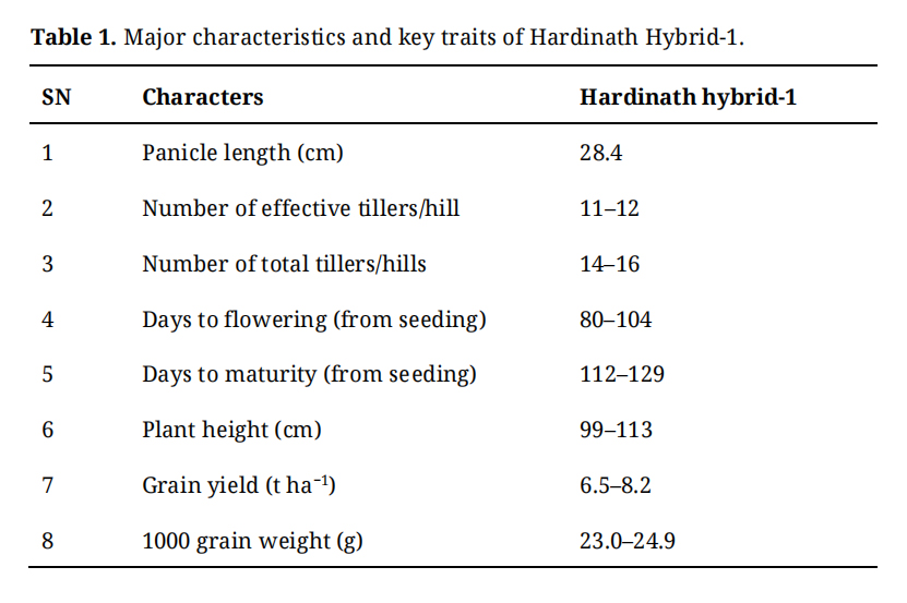 Hardinath Hybrid-1 is a high yielding, semi-dwarf hybrid rice variety that matures early (115–125 days) and is well-suited for double-rice and rice-vegetable systems, which dominate the mid hills, valley, and Inner Terai regions. It is a three-line system hybrid, comprising an A-line (Cytoplasmic male sterile (CMS line), B-line (maintainer line), and R-line (restorer line). This article describes the development of Hardinath Hybrid-1 and its major characteristics.