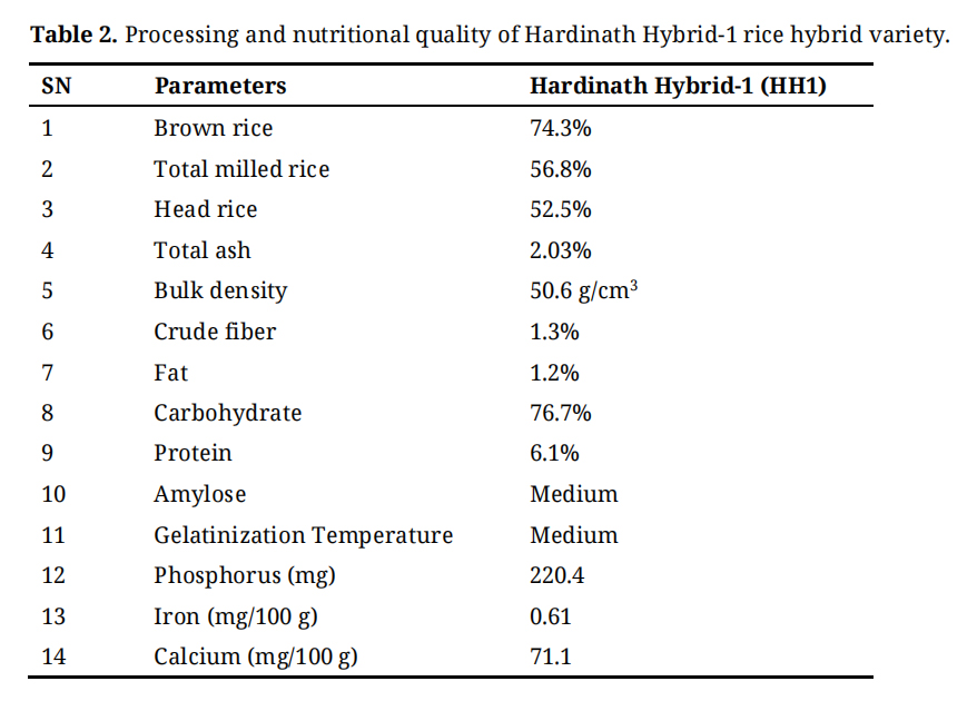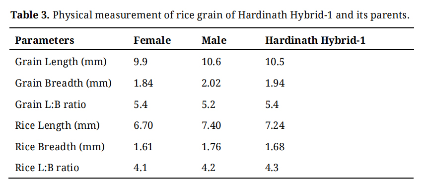 Grain Quality and Economically Important Traits of Hardinath Hybrid-1Hardinath Hybrid-1 grains have an attractive physical appearance, characterized by their long, slender shape. This variety has moderate amylose content and a balanced gelatinization temperature (Table 2), both of which are important for achieving the ideal texture of cooked rice, particularly for consumers in Southeast Asia. The grain length, breadth and grain length-to-breadth ratio refer to the unhulled grain, and the rice length, breadth, and rice length-to-breadth ratio refer to hulled rice (Table 3). The grain length of Hardinath Hybrid-1 is 7.2 mm, with a grain breadth of 1.6 mm, resulting in a length-to-breadth ratio of 4.3 (Table 3). This ratio is notably higher than that of other popular rice varieties, such as Khumal-4 [7], Sabitri, and Swarna.