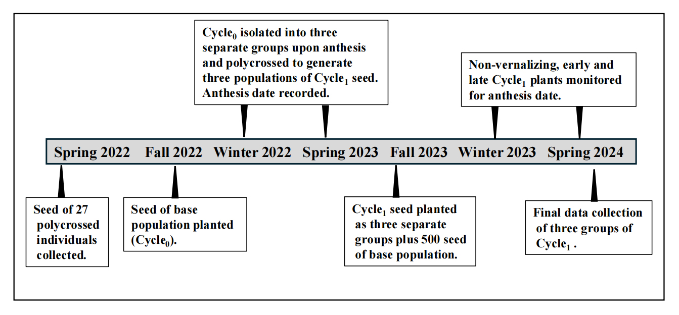 A seed increase was made during fall/winter 2022. Nine hundred and three seedlings of the base population shown in Figure 1 were germinated and grown in 50-cell deep trays under ambient outdoor fall conditions until predicted temperatures were significantly below freezing, then plants were moved to a cold greenhouse with a minimum temperature of 0 ℃. This population (Cycle0) was segregated as they matured based on anthesis. Three distinct parental groups were made during spring 2023: the “NV0” consisting of 11 non-vernalizing progenies, the “E0” group consisting of the 70 progenies earliest to anthesis, and the “L0” group, comprising the last 70 individuals to reach anthesis. The balance of the 903 were discarded because their anthesis occurred between the selection extremes. These select groups were allowed to polycross isolated from one another and other pollen sources giving rise to three Cycle1 seed populations: NV1, E1, and L1 in spring 2023 (Figure 1). Cycle1 seed were planted 3 October 2023 as described previously. Anthesis data were collected on each individual within each population as they matured, thus providing actual mean anthesis dates for comparison using equation (1) to predict gain due to selection.