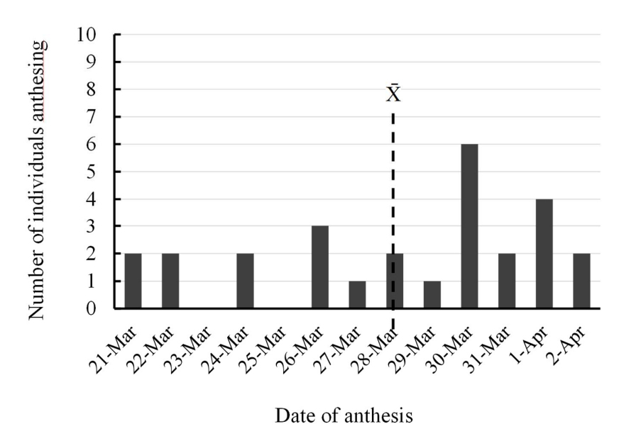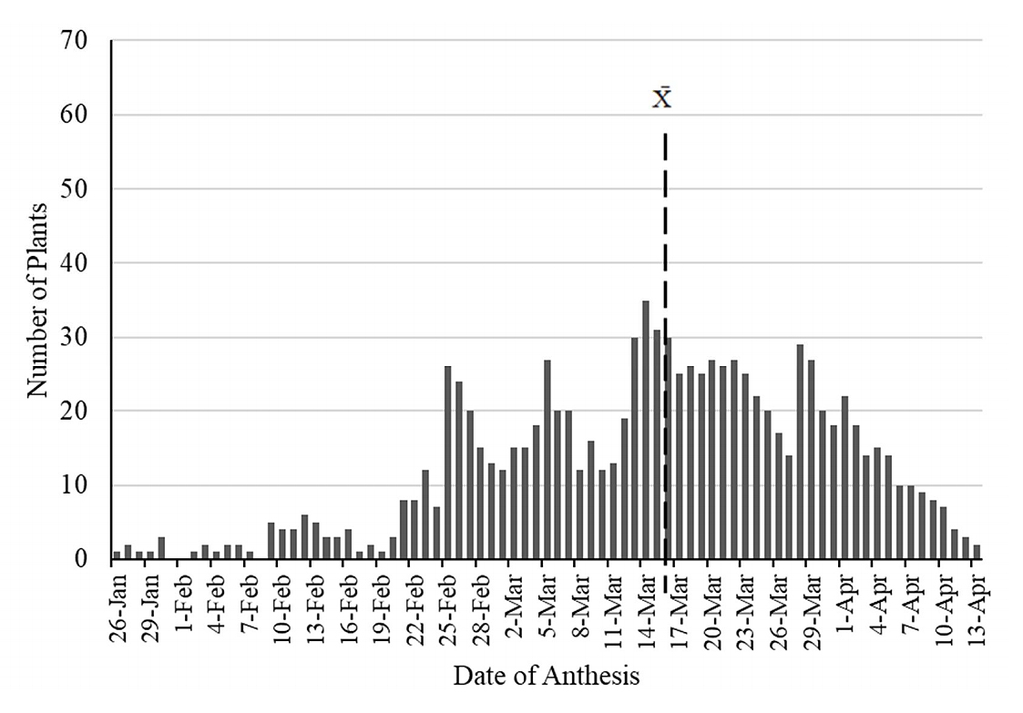 The genetic gain was measured in terms of days gained or lost by comparing the mean anthesis date of NV1, E1, and L1 to that of the B population as the standard using equation (1). When the mean anthesis date of the B population grown in 2023 (Figure 4) was compared with the other three populations, a shift in anthesis date to that of the B population was observed (Figure 2 vs Table 1) compared to the prior year. The NV1 population, with a mean anthesis date of 14 March 2024 (Figure 5), had the greatest genetic gain of 18 compared to the other populations. The E1 population, with a mean anthesis date of 18 March 2024 (Figure 6), had an advancement of 14 days compared to B. The genetic gain for E1 was +14 days. And the lowest was L1 for which the mean anthesis date was 11 April 2024 (Figure 7). The L1 population flowered 10 days later than the B population. Hence, it had a genetic gain of −10 days compared to B.
