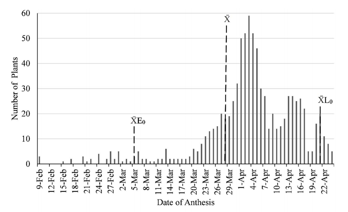 The same equation predicts a mean anthesis date of the L1 population as follows: (87 + 6) 94th ordinal day of the year or 4th April. To make the selection more effective and keep the selection intensity at 10%, the final 70 plants of the population to reach anthesis were isolated and polycrossed as the parents of the late population (L0). This group had an anthesis date ranging from 18 April 2023 to 28 April 2023 with the mean anthesis date of 21 April 2023 (Figure 3).