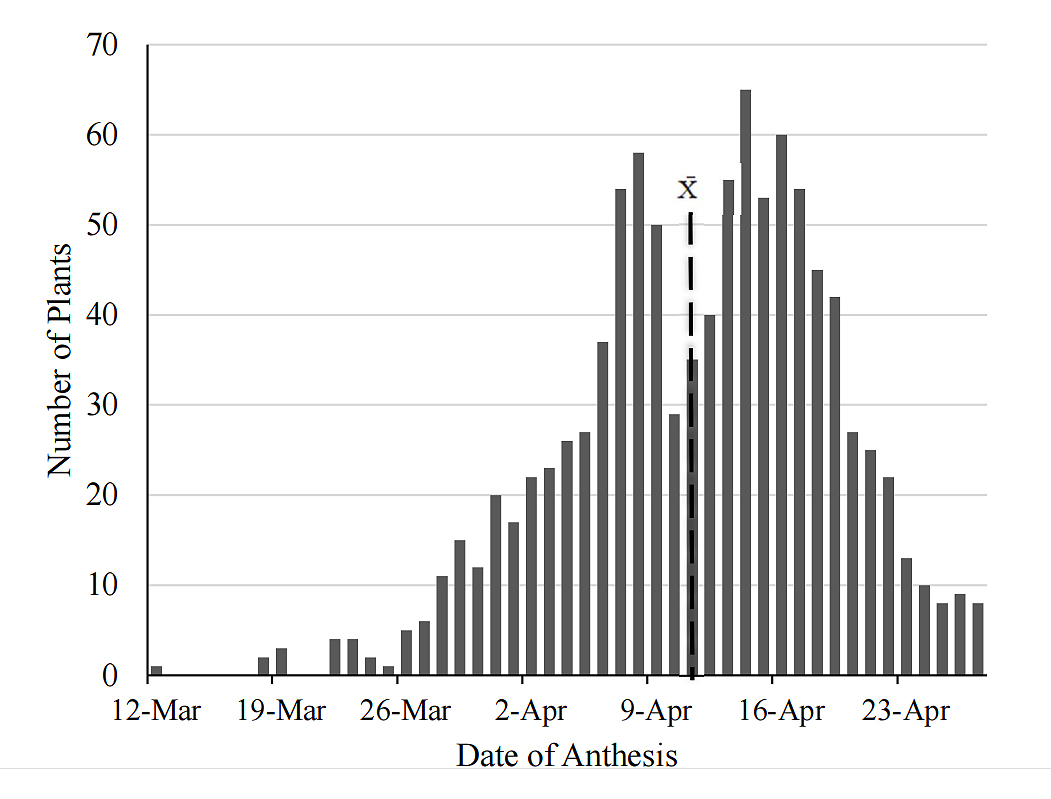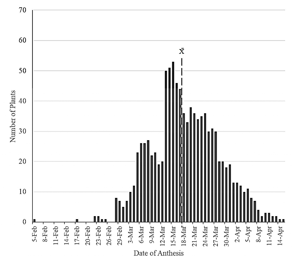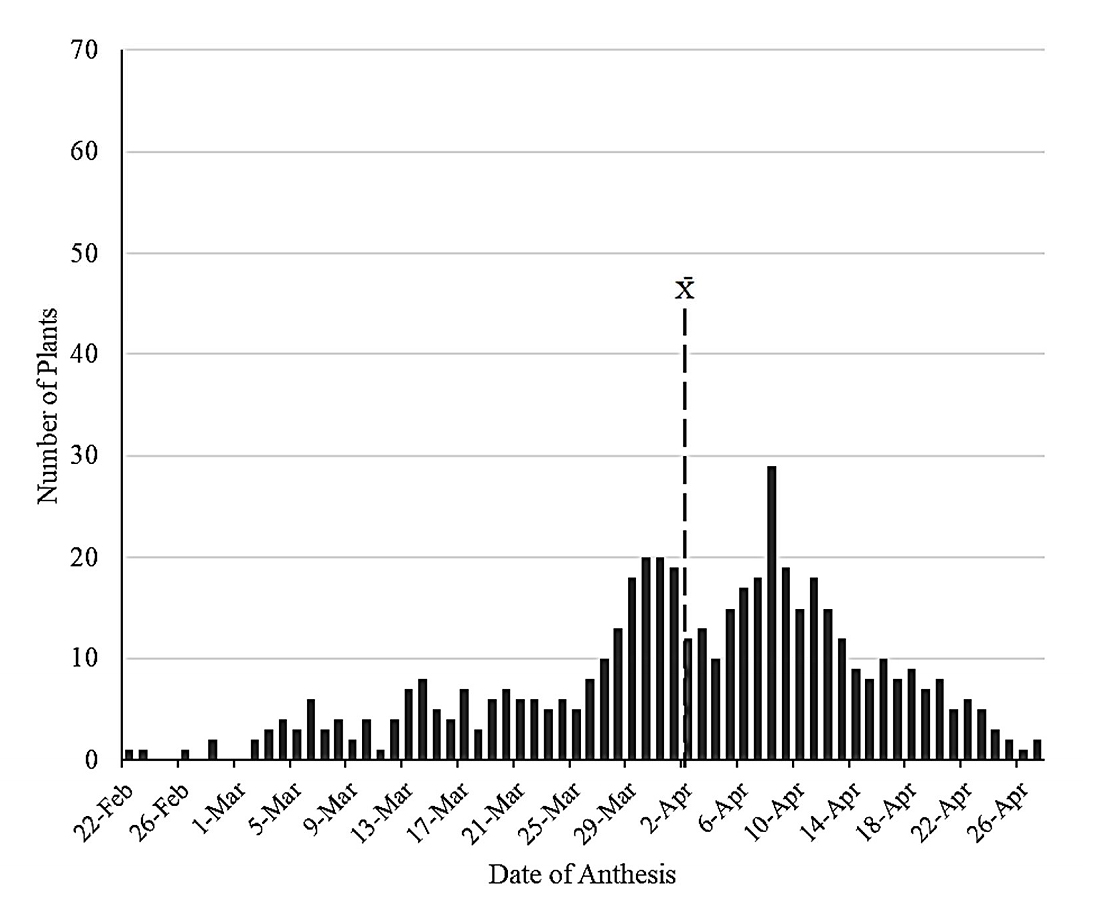 A base population of 27 individuals was collected in 2022. Individuals of the base population were feral (Figure 1). This population had anthesis dates ranging from 21 March 2022 to 2 April 2022, with a mean anthesis date of 28 March 2022 (87th day of 2022) (Figure 2). These individuals arranged as a randomized design were allowed to polycross in isolation. The resulting seed were planted the following fall in media composed of 80:20 (V:V) peat: sand into 50-cell “deep” flats (12.7 × 27.8 × 54.5 cm; T.O. Plastics®—Greenhouse Megastore, Clearwater, MN) in the greenhouse of R.R. Foil Plant Science Research Center, Starkville, MS, US (33.457952, −88.754920). To minimize environmental effects, all plants were grown in a randomized arrangement under uniform conditions and uniform containers, ensuring phenotypic selections predominantly reflect genetic differences. After emergence, approximately two weeks after seeding, seedlings were thinned to a single plant per cell. Irrigation was applied daily unless there was a rainfall event. Fertilization was applied every two weeks as Peters 20-20-20 Water Soluble fertilizer according to label instructions. If predicted temperatures were expected to be significantly below freezing, plants were moved to a cold greenhouse with a minimum temperature of 0 ℃.
