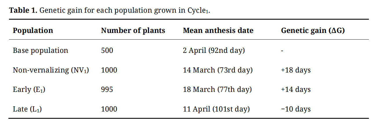 Where the selection intensity (i) is a selection proportion of 10% measured in standard deviation units (1.909). Standard deviation (σ) was calculated from the mean date of anthesis from the original base population. The heritability (h2) for the date of anthesis was estimated to be 0.7 [16]. (1) ; (2) .