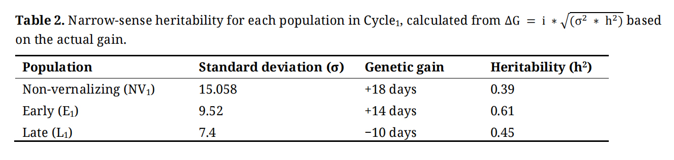The NV1 population with +18 days genetic gain had the least h2 of 0.39 (Table 2). The E1 population with +14 days genetic gain had the greatest h2 of 0.61. The L1 population with −9 days had a h2 of 0.45.
