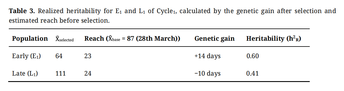 The math from equation (1) suggests that selection under these parameters would result in a genetic change of ± six days in the occurrence of anthesis in the subsequent generation.