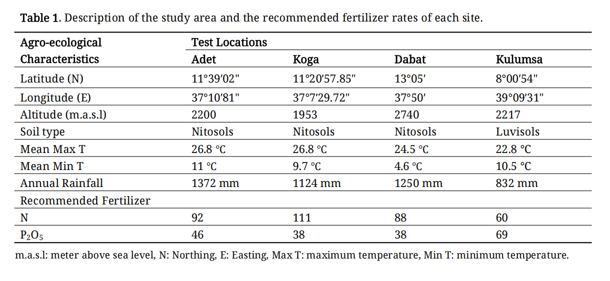 Field trials were conducted at four locations known for wheat production: Adet, Koga, Dabat, and Kulumsa (Table 1). Hereafter, the term ‘genotypes’ will be used to refer to both the elite breeding lines and released varieties.