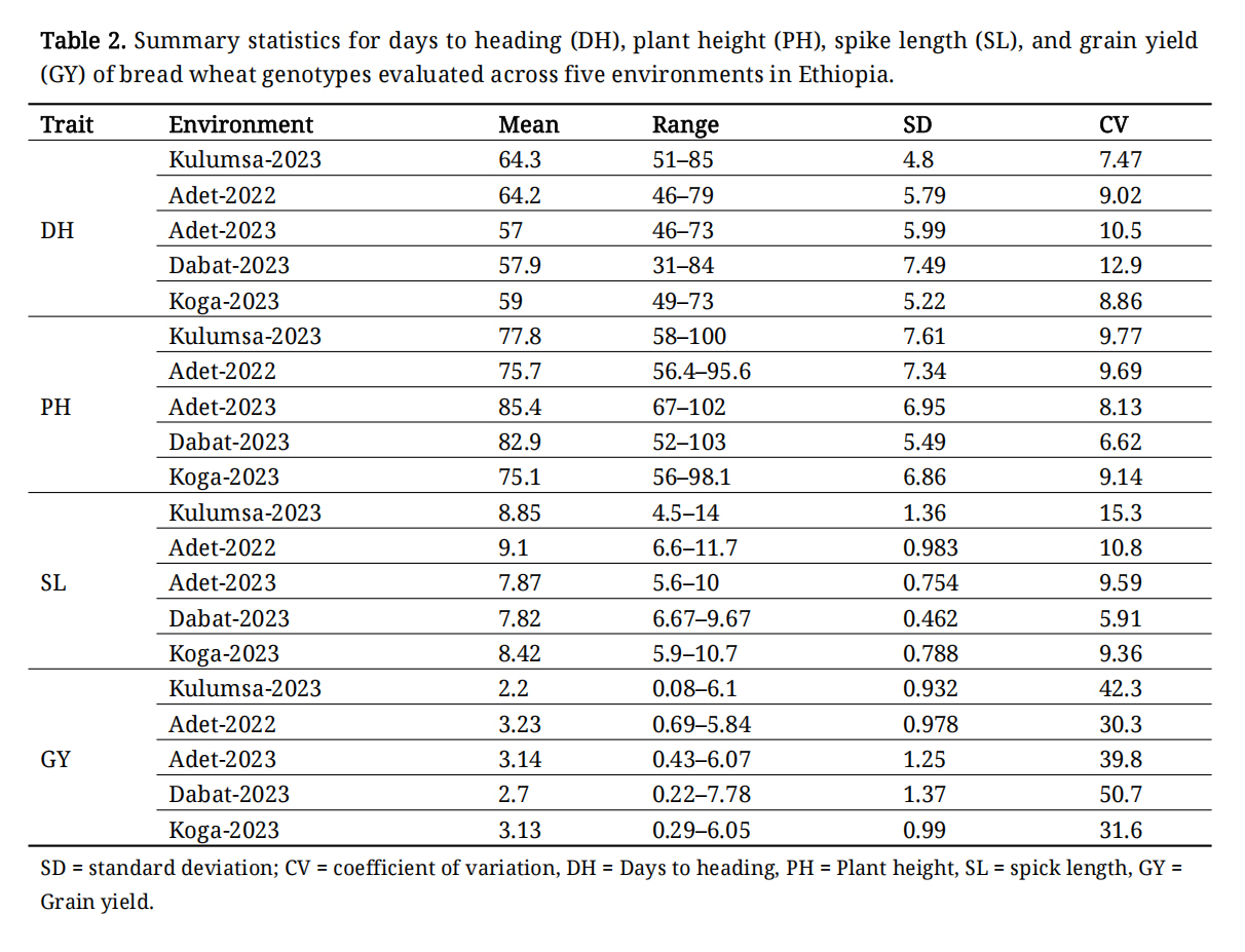 Conducting multi-environment trials with wheat germplasm sourced from ICARDA is expected to facilitate the development of improved wheat varieties by identifying genotypes that exhibit desirable agronomic traits and resistance to major diseases. This study aimed to evaluate phenotypic stability and genotype-environment interactions across various traits in a diverse group of elite and commercial bread wheat genotypes.