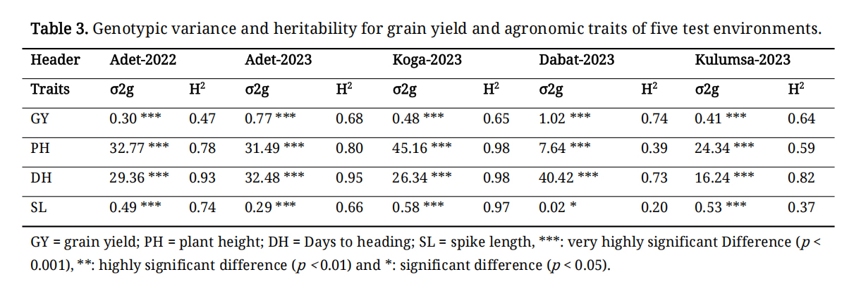 Significant differences among genotypes were observed across all five environments for all measured agronomic traits and grain yield, with the exception of spike length at Dabat (Table 3). Plant height and days to flowering exhibited the highest genotypic variance across all environments, whereas spike length showed the lowest genotypic variance.