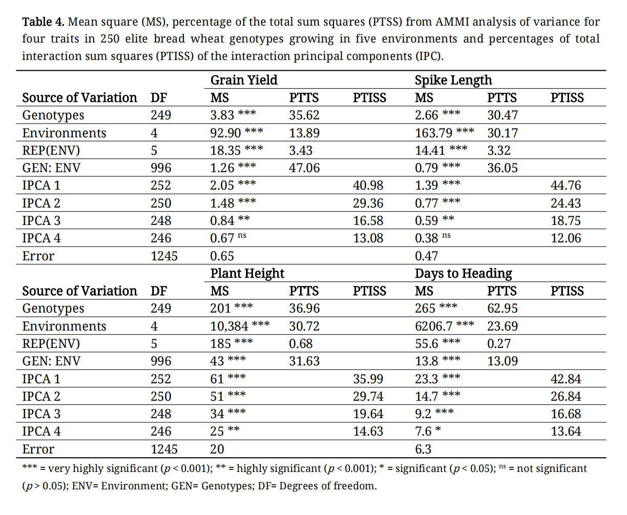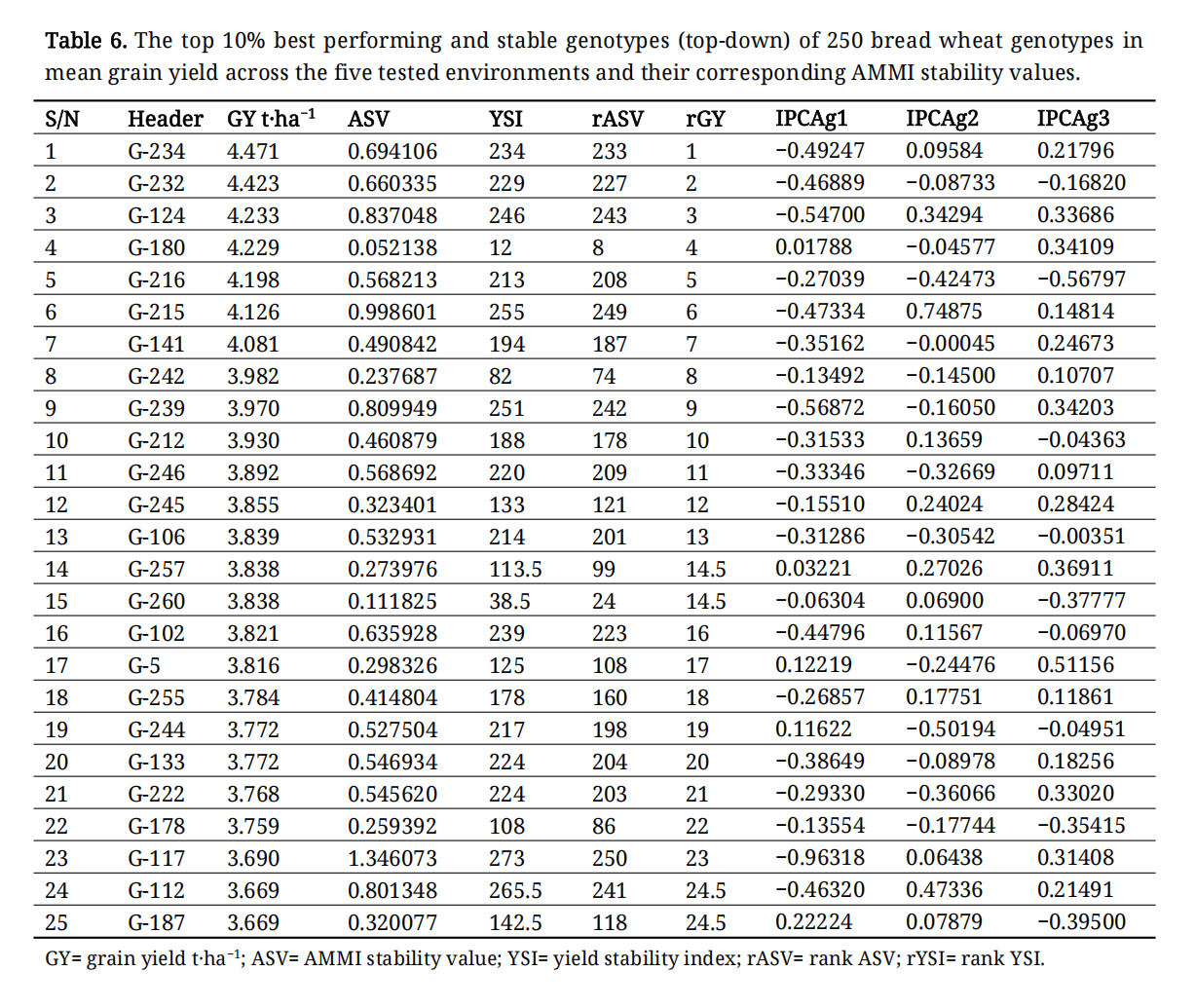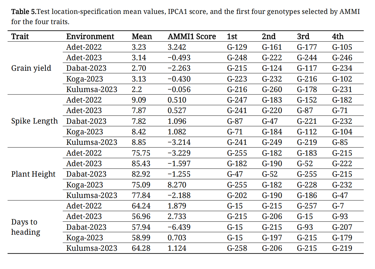 Previous research has employed AMMI 1 and AMMI 2 biplots to explore and evaluate the relationship between environment (E), genotype (G), and GEI. The current study utilized AMMI analysis to identify four top-performing and stable genotypes for grain yield and other relevant traits at each of the five test sites. Additionally, AMMI biplot analysis identified G-180, G-260, G-257 and 242 as high-yielding and stable genotypes across all test sites. Consequently, these genotypes are well-suited for inclusion in bread wheat breeding programs aimed at developing new varieties capable of producing high and consistent grain yields in environments like those examined in the present study.