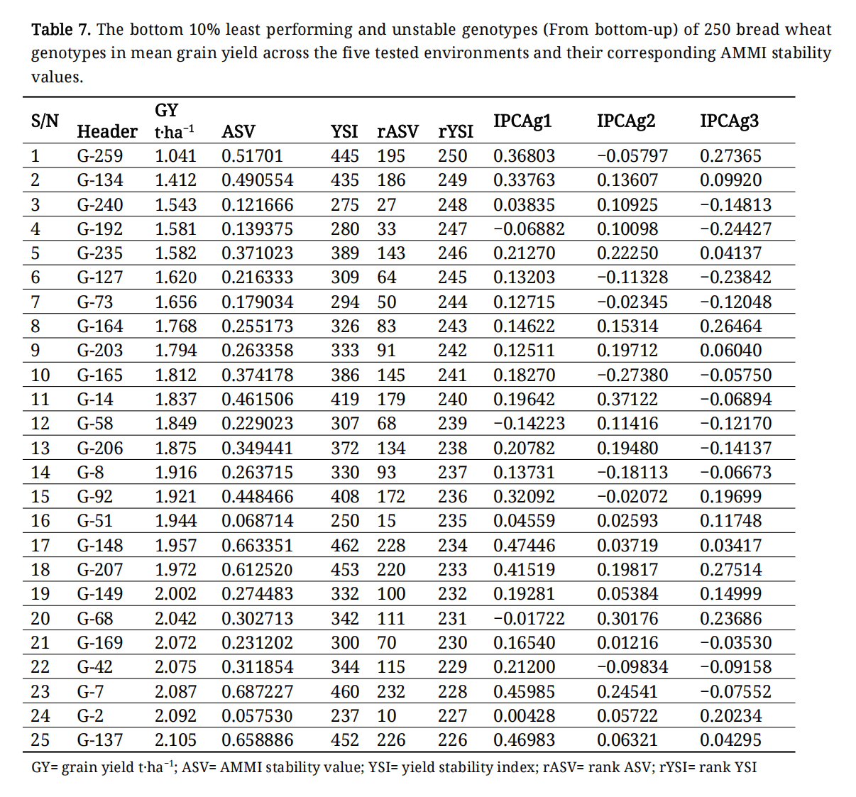 The AMMI analysis is frequently employed to identify high-performing, stable genotypes, with an IPCA1 value close to zero indicating stability. The AMMI, additive main effects, and multiplicative interaction stability value (ASV) for grain yield of to 10% and bottom 10% of the genotypes is presented in Tables 6 and 7. The range of ASV value from 0.011 (G-82) to 1.35 (G-117) was observed for grain yield.