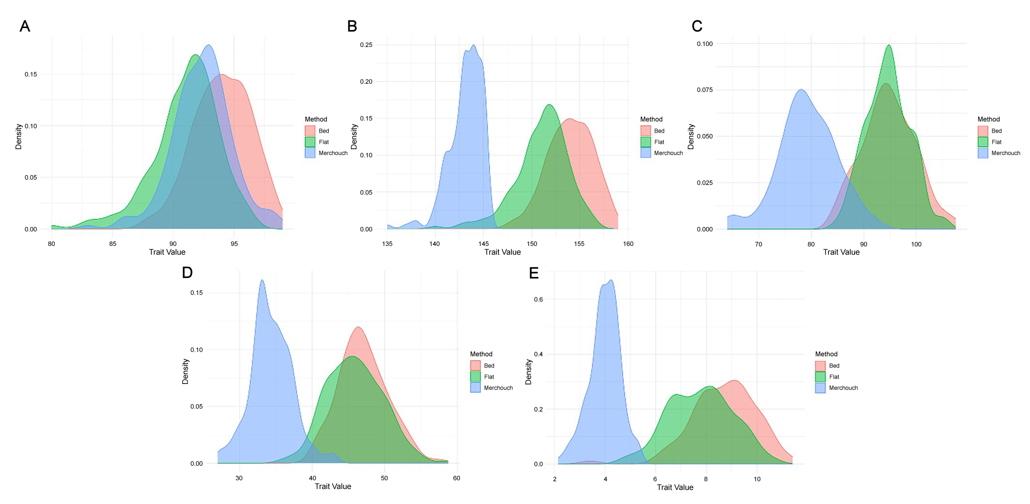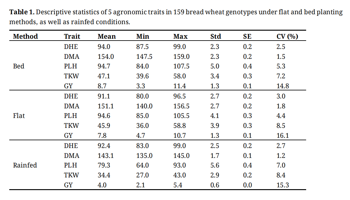 The present study investigated 159 spring bread wheat genotypes for 5 traits, grain yield (GY), days to heading (DH), days to maturity (DM), plant height (PTH), and thousand kernel weights (TKW) across the three conditions. Figure 1 showcases the density distribution of agronomic traits in 159 bread wheat genotypes under both bed and flat planting methods as well as under rainfed conditions, revealing that almost all traits exhibit a unimodal distribution.