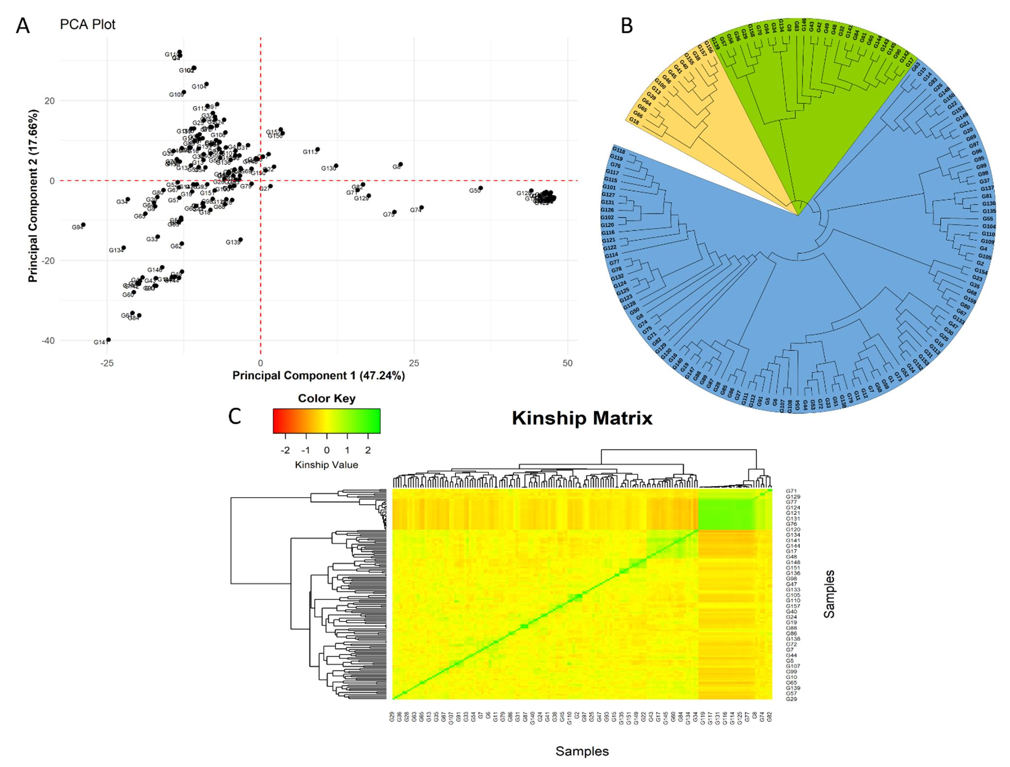 PCA, Neighbor-Joining (NJ) Tree and KinshipFigure 4 presents the Principal Component Analysis (PCA), Neighbor-Joining (NJ) tree, and kinship matrix of bread wheat genotypes based on genotypic data. Figure 4A displays the distribution of genotypes along the first two principal components (PC1 and PC2), which account for 47.24% and 17.66% of the total variation, respectively. The spread of genotypes across the plot highlights genetic diversity, with clustering patterns indicating varying degrees of relatedness. Figure 4B illustrates the NJ tree constructed from 159 bread wheat genotypes. The tree reveals three distinct subpopulations, visually separated by different colors, representing genetic groupings. This clustering reflects genetic similarities and evolutionary divergence among the genotypes. Figure 4C depicts the kinship matrix, providing insights into the genetic relatedness among genotypes. The diagonal (in green) represents self-relatedness, where each genotype shows the highest kinship with itself. Off-diagonal greenish regions indicate genotypes with closer genetic relationships, while yellow to red areas reflect lower kinship, signifying more distantly related genotypes. This visualization emphasizes the genetic structure and diversity within the population.