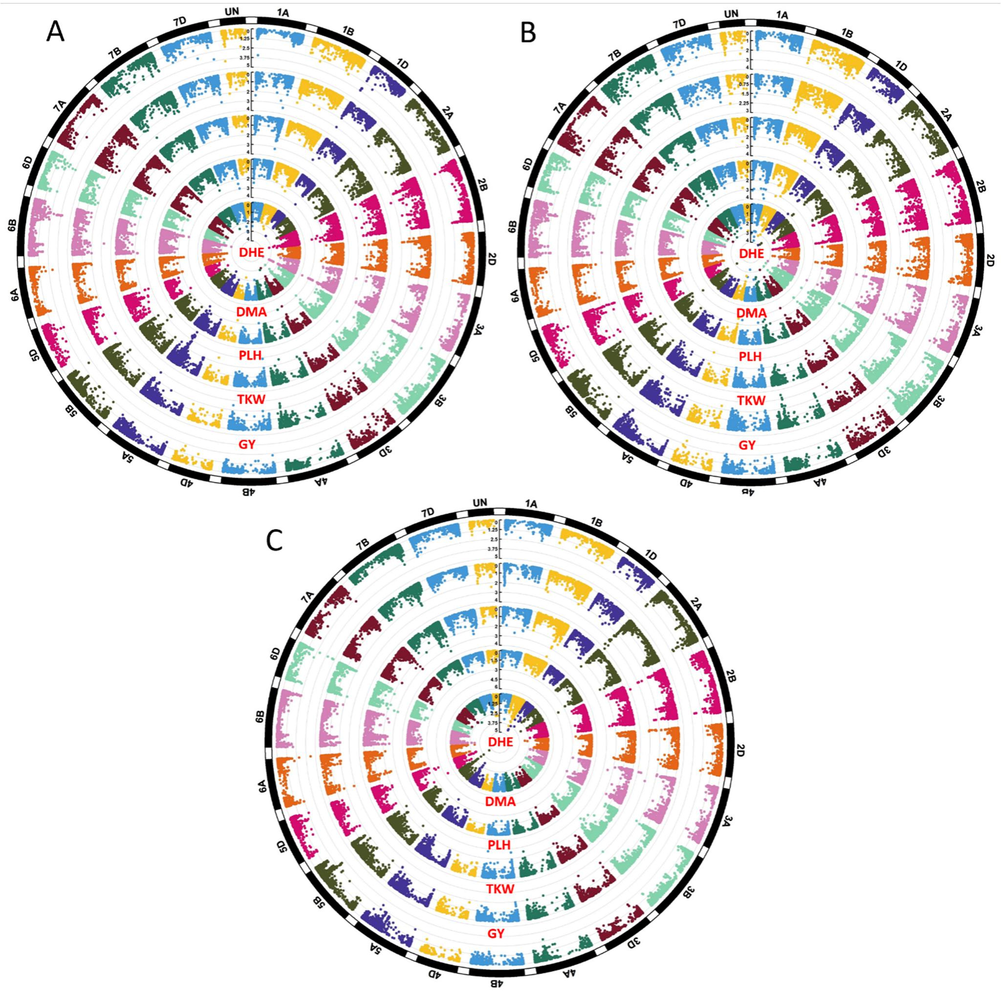 DNA Extraction and GenotypingThe wheat samples underwent genotyping utilizing the Wheat Illumina iSelect 25K single nucleotide polymorphism (SNP) array at the SGS Institut Fresenius GmbH TraitGenetics Section in Gatersleben, Germany. Samples were obtained from the flag leaves of each genotype, put on plates, and then sent to the laboratory for DNA extraction and genotyping. A total of 159 bread wheat genotypes were examined using 23K SNP markers. Subsequent to data collection, the genotypic data was subjected to a filtering process to preserve only the most reliable information for analysis. SNPs having a minor allele frequency (MAF) under 5% and heterozygosity over 10% were eliminated. Following this screening procedure, 17,968 SNPs were retained, serving as the foundation for further GWAS investigations.