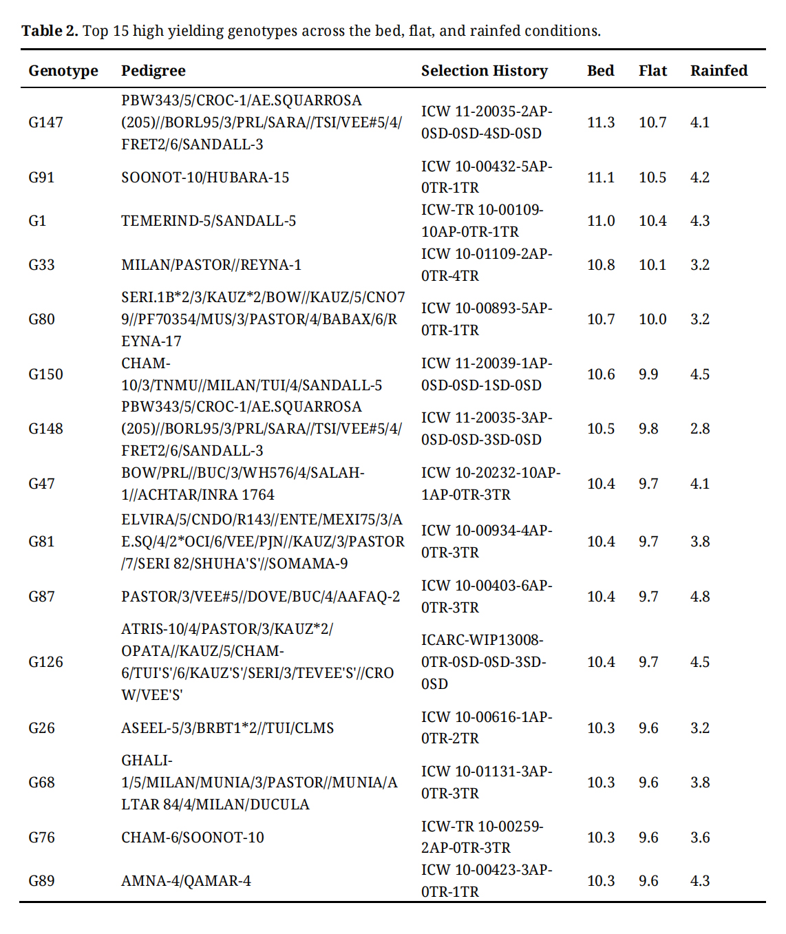 Table 2 provides detailed performance data for grain yield (GY) under raised bed and conventional flat cultivation methods as well as rainfed conditions for the top high-yielding genotypes. The raised bed cultivation technique produced higher yields than the flatbed method. Figure 3 illustrates the performance of the top genotypes under each cultivation method, underscoring the impact of raised bed cultivation in enhancing grain yield production. Of all the genotypes, the genotype G147 (PBW343/5/CROC-1/AE.SQUARROSA (205)//BORL95/3/PRL/SARA//TSI/VEE#5/4/FRET2/6/SANDALL-3) recorded the highest GY, with 11.4 tons/ha under raised beds, 10.9 tons/ha under flats, and 4.07 tons/ha under rainfed conditions. Followed by, genotype G91 (SOONOT-10/HUBARA-15) recorded the GY, with 10.4 tons/ha under beds, 9.7 tons/ha under flats, and 4.21 tons/ha under rainfed conditions.