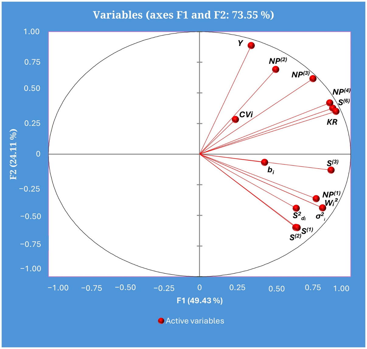 Intriguingly, S(1) and S(2) not only exhibit a significant positive inter-correlation but also maintain a positive linkage with other stability metrics (S(3), S(6), NP (1), NP(4), KR, Wi2, σ2i, bi, s2di), notwithstanding their significant negative correlation with mean yield (Y) and CVi. S(3), emerges as positively correlated with mean yield and all other stability metrics, except for CVi. Moreover, S(6), NP(4), and KR stand out for their significant positive correlation with both mean yield and the entire spectrum of stability metrics under evaluation. NP(2) is distinctively characterized by its negative correlation with S(1) and S(2), while it upholds a positive relationship with the rest of the metrics. NP(3), conversely, aligns positively with all other metrics, except for S(1) and S(2), with which it shows no significant correlation.