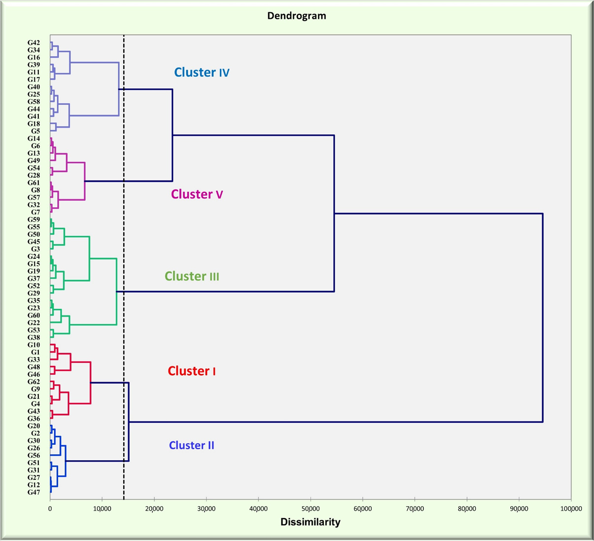 The methods employed in our investigation to assess stability did not offer a comprehensive insight into how individual hybrids respond to varying environmental conditions. Certain hybrids exhibited stability according to certain parameters while showing instability according to others. This issue aligns with findings from prior studies on hybrid-environment interaction [17,33]. A novel strategy to address the inherent variability in hybrid responses was the categorization of hybrids into distinct, qualitatively similar stability groups via cluster analysis, a method supported by [15,33]. This approach facilitated a more structured understanding of hybrid performance across varying conditions. In this vein, the analysis successfully classified 62 maize hybrids into five distinct clusters as shown in (Figure 2, Supplementary Material Table S3). Significantly, Cluster I emerged as a group of high-yielding hybrids, characterized by moderately stable performance across environments (with stability parameter sum ranks between 200 and 444). This suggests a potential for specific environmental adaptations among these hybrids. Notably, hybrids G46, G48, and G10, which are among the top performers in terms of grain yield (ranked 1, 2, and 4, respectively), were grouped within this cluster, indicating their robustness in certain conditions.